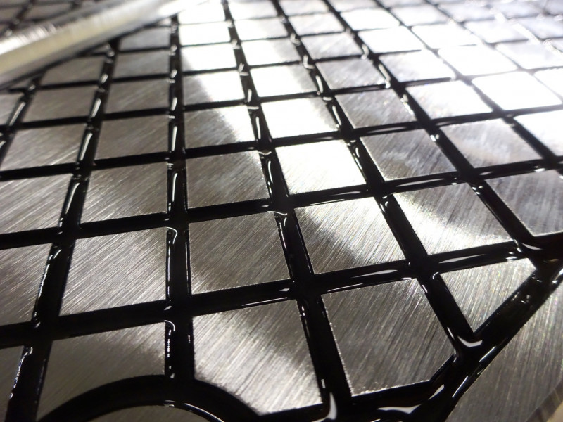 Schriftzug und Randlinie/Gitterstruktur wird mit schwarzem Lack angefüllt (Standard)