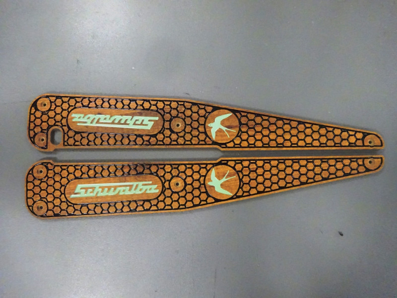 1 Paar Trittbretter, Dekor: Lärche, Struktur: 15mm Gitterstruktur, Schriftzug: Schwalbe altdeutsch, Symbol: Sandmännchen