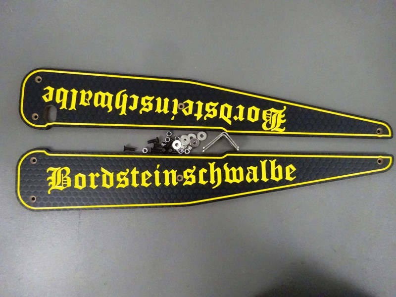 1 Paar Trittbretter, gaaanz lang 69 cm, mit farbiger Randlinie und Schriftzug „Bordsteinschwalbe“,