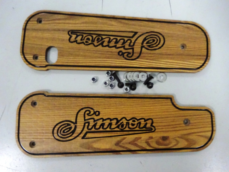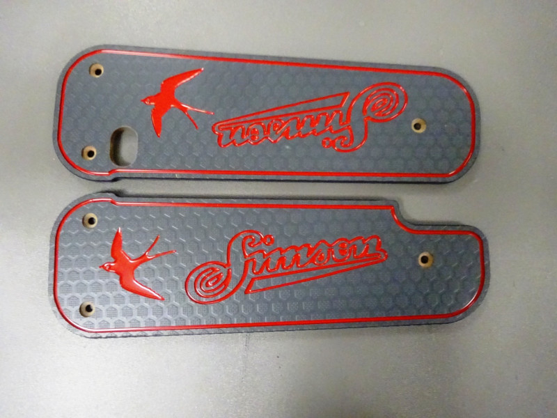 1 Paar Trittbretter, normale Länge, mit Schriftzug „Simson geschwungen“ und farbiger Randlinie,