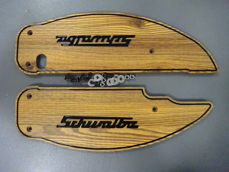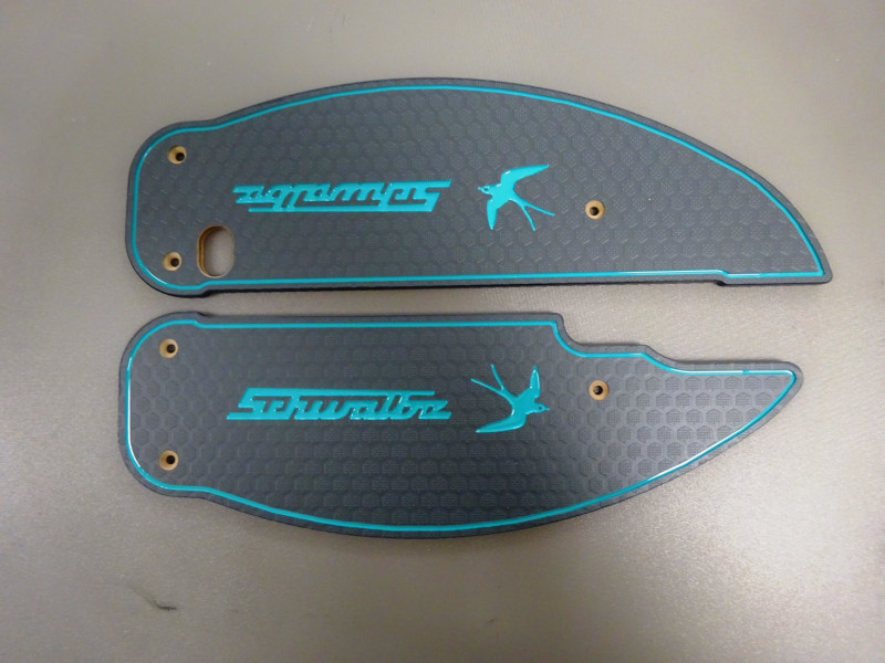1 Paar Trittbretter, „verlängert + verbreitert“, (für Plattfüße 😉 ) mit farbiger Randlinie, Schriftzug